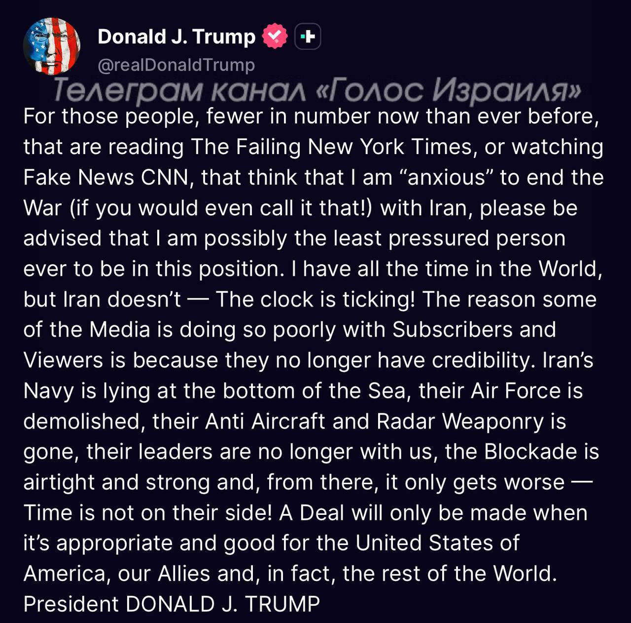 Основываясь на том факте, что правительство Ирана серьезно расколото (что не стало неожиданностью), а также по просьбе фельдмаршала Асима Мунира и премьер-министра Пакистана Шехбаза Шарифа, нас попросили отложить атаку на Иран до тех пор, пока их лидеры и представители не смогут выработать единое предложение. В связи с этим я поручил нашим военным продолжать блокаду и во всех остальных отношениях сохранять полную боевую готовность, и, следовательно, продлю режим прекращения огня до тех пор, пока не будет представлено их предложение и дискуссии не будут завершены тем или иным образом, — президент Трамп