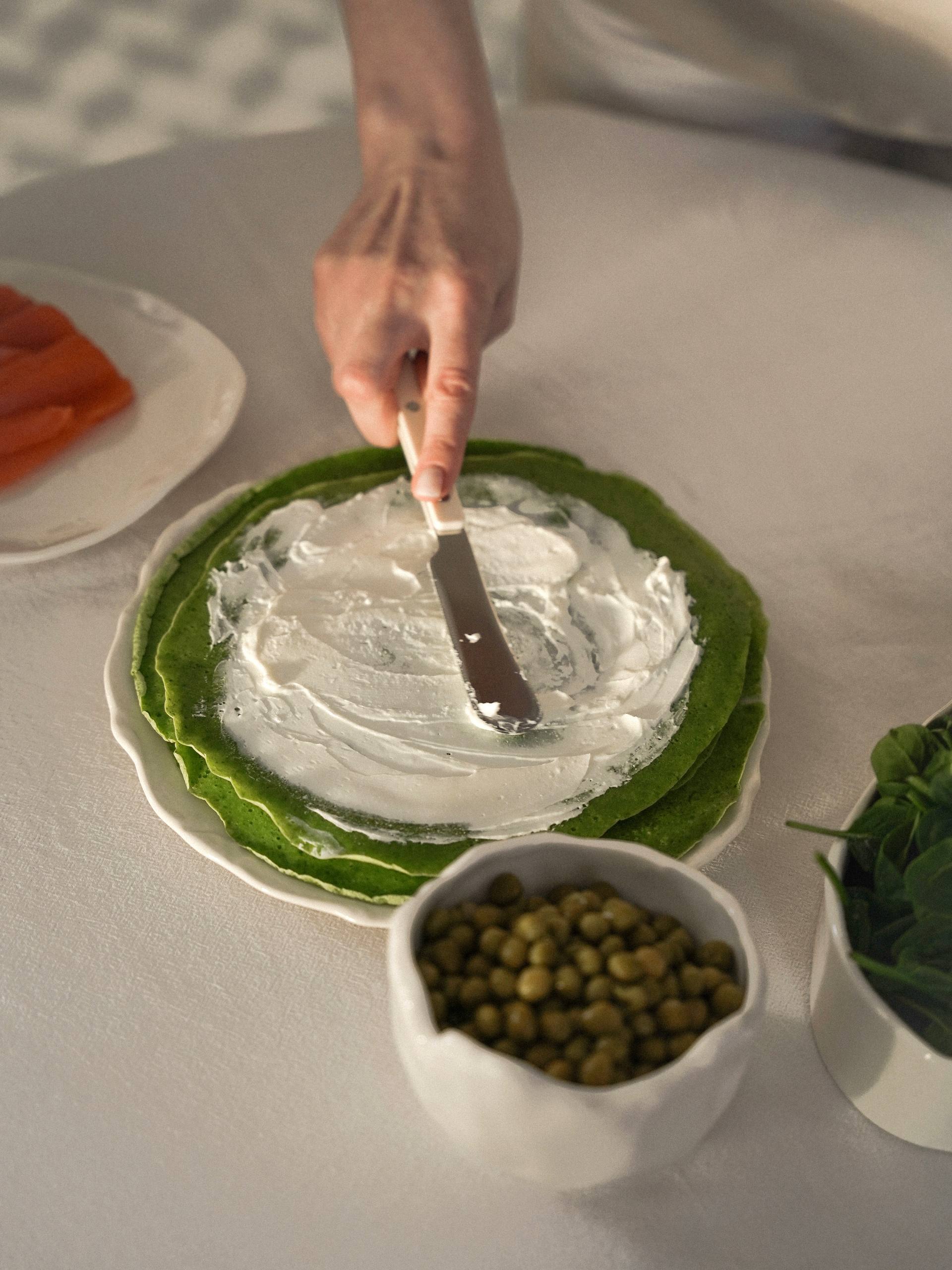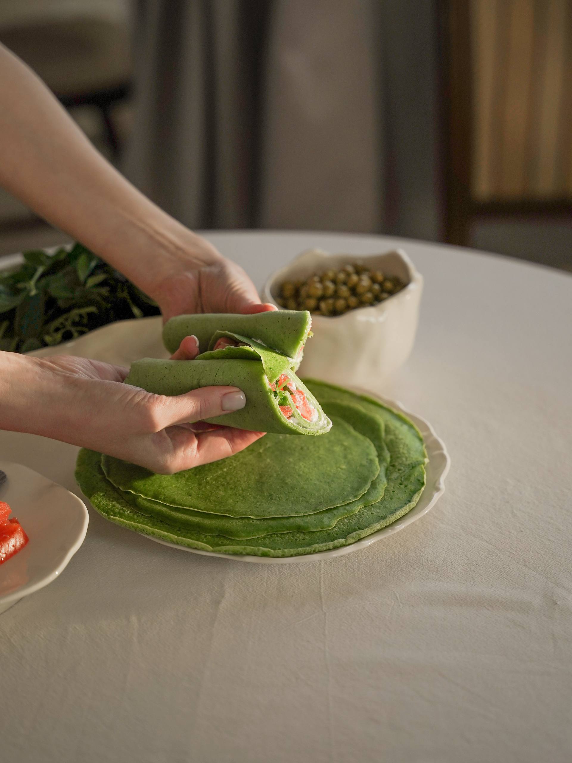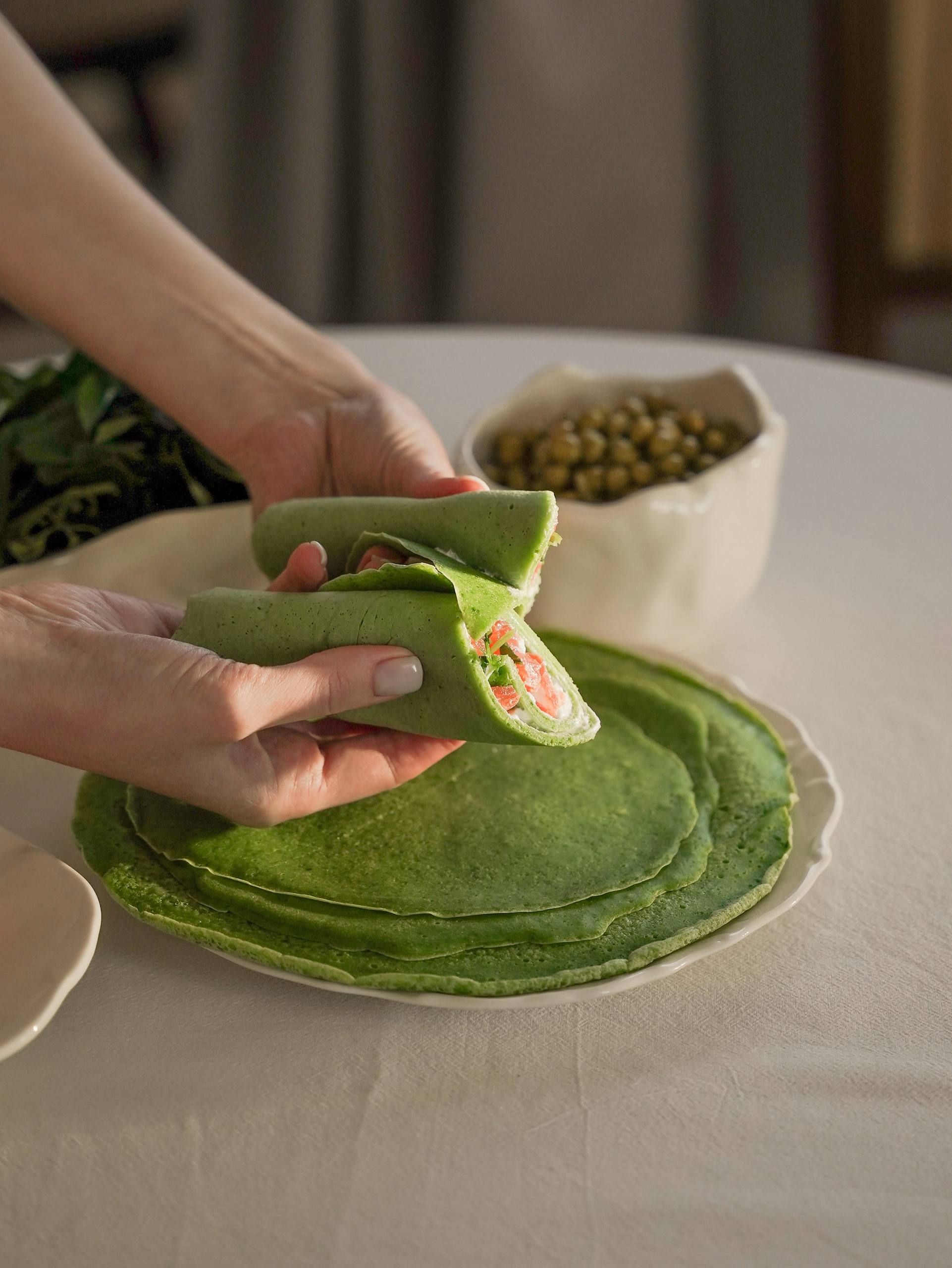 В нашем варианте приготовления мы сделали начинку из творожного сыра, слабосоленой семги, горошка и микрозелени.