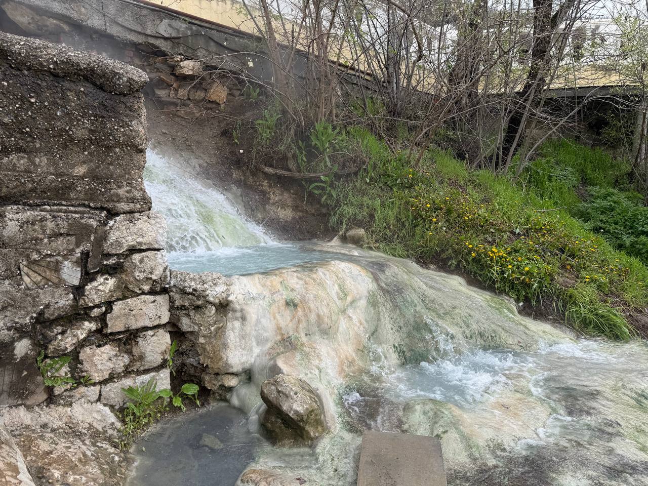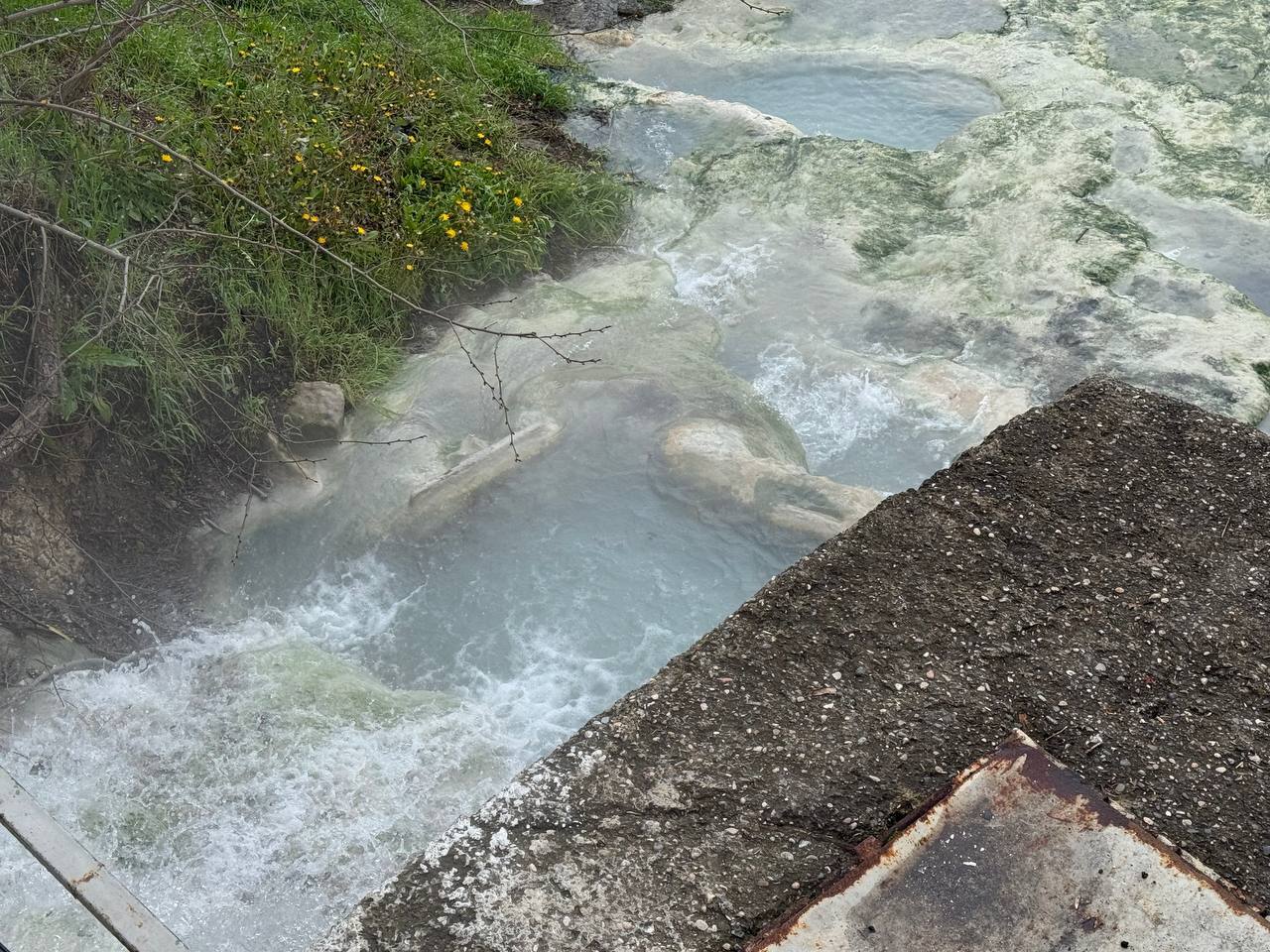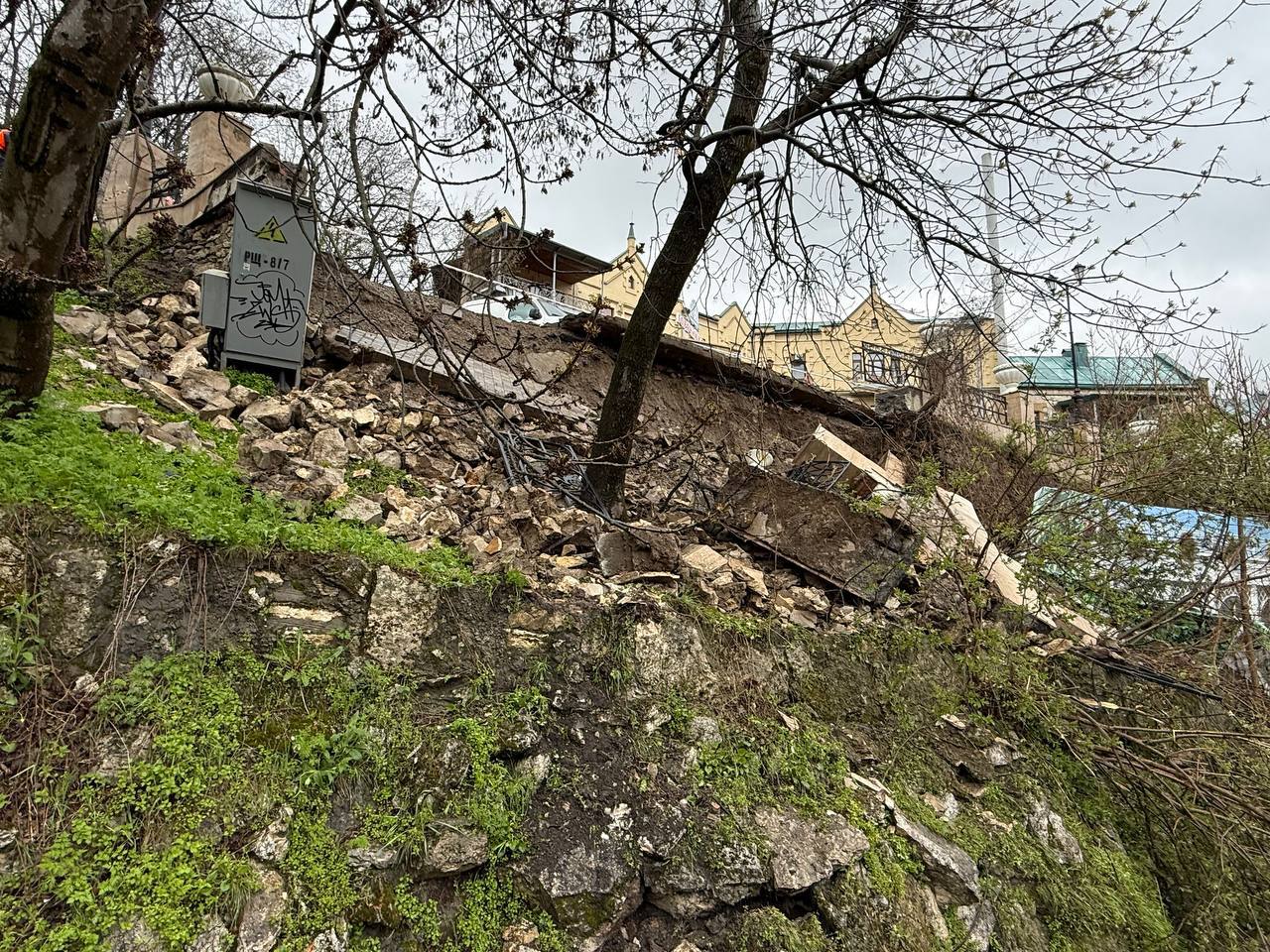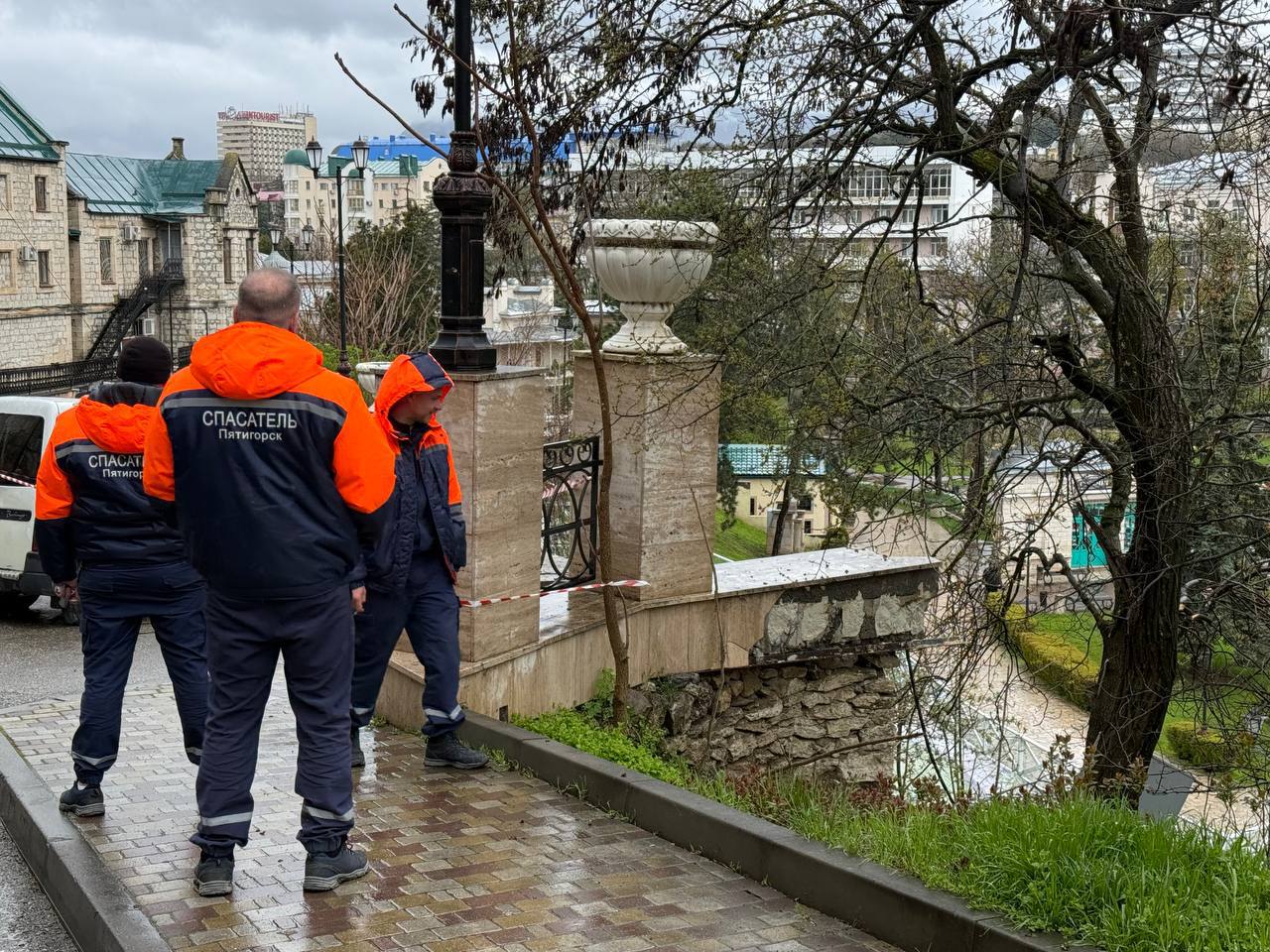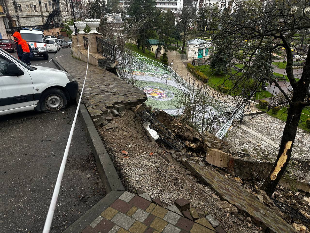 В результате обильных осадков произошло частичное подмывание склона на въезде в санаторий «Горячий ключ». Из-за этого случилось обрушение участка подпорной стены и тротуара.