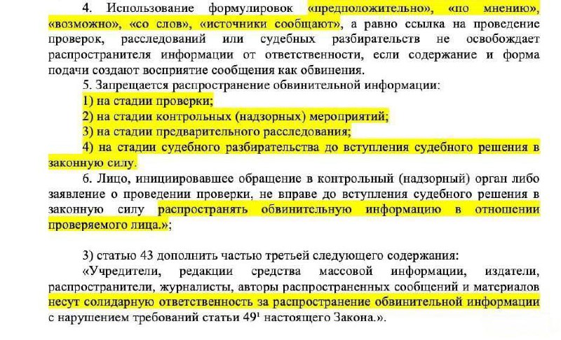 В Госдуму внесен проект закона серьезно ограничивающий работу СМИ. Журналистам хотят запретить писать по мнению и источники сообщают в обвинительном контексте до вступления решения суда в силу. Под запрет также попадут журналистские проверки и расследования. За нарушения предлагают штрафовать: граждан — на 100–300 тыс. рублей, должностных лиц — на 300–700 тыс., а компании — на 1–2 миллиона.