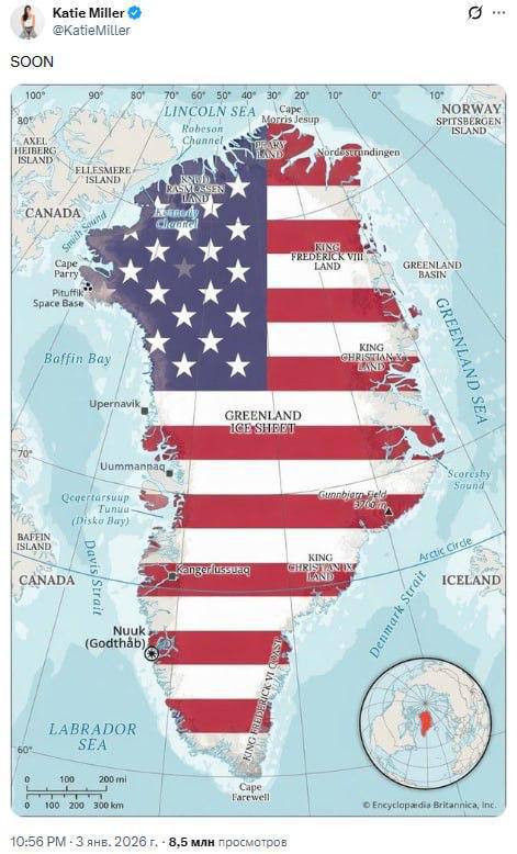 Наступна все-таки Гренландія? Дружина заступника глави адміністрації Білого дому Стефана Міллера натякнула на нову мету США з підписом «скоро» – за 10 годин фото набрало більше 8 000 000 переглядів. Тим часом, The Guardian каже, що наступними цілями Трампа можуть стати Іран, Куба і Гренландія. 🇺🇦Реальна Війна | Підписатись