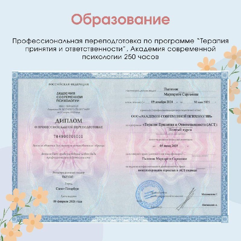 Меня зовут Маргарита, я дипломированный клинический психолог, консультирую в подходе Терапия принятия и ответственности (ACT).