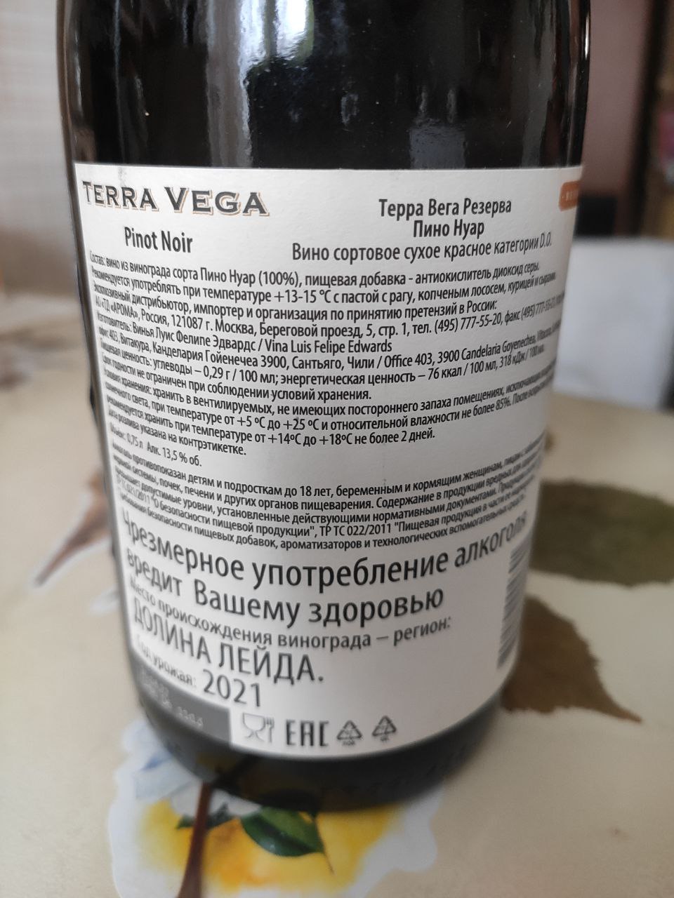 Считается, что пино нуар особенно хорошо получается в чилийской Долине Лейды. И это подтвердило вино Terra Vega. Я его купил за 700 рублей в КиБ, но довольно давно. Возможно в каких-то удаленных регионах России оно все ещё доступно.