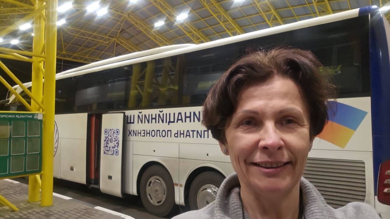 Так выглядят автобусы с беларусскими экс-политзаключенными в пункте пропуска «Ягодин — Дорогуск» на границе Украины и Польши. На снимке — глава миссии беларусских демсил в Киеве Светлана Шатилина.