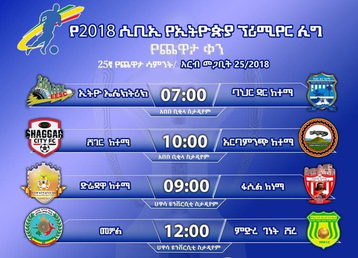 አዲስ አበባ፣ መጋቢት 25፣ 2018 (ኤፍ ኤም ሲ) በ25ኛ ሳምንት የሲቢኢ ኢትዮጵያ ፕሪሚየር ሊግ መርሐ ግብር ዛሬ አራት ጨዋታዎች ይደረጋሉ፡፡