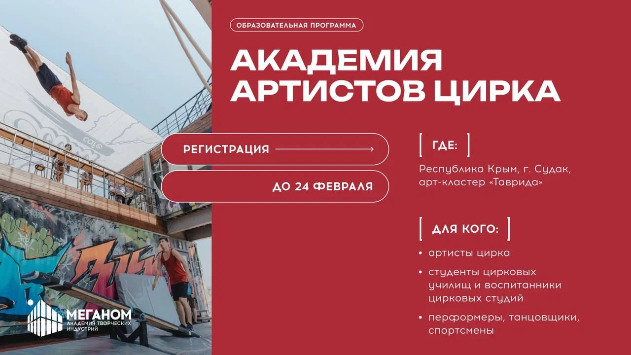 Программа проекта Таврида.АРТ для студентов и выпускников цирковых училищ, воспитанников студий и практикующих артистов. Комплексный подход к развитию: совершенствование техники, работа над сценической формой и самопрезентацией, развитие психоэмоциональной устойчивости и поддержание физической формы. В программе — творческая лаборатория и кастинги цирковых и театральных компаний.