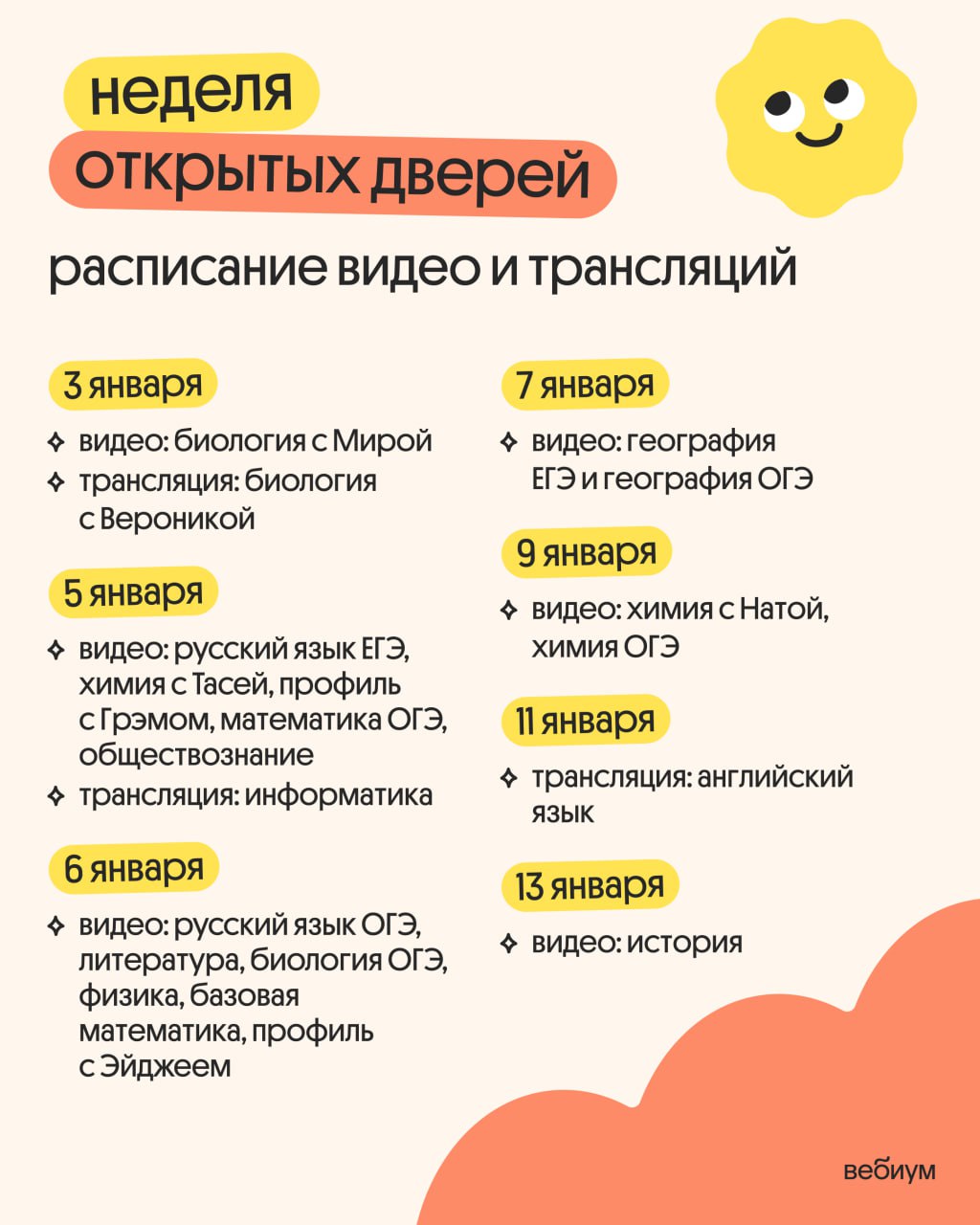 5-11 января в Вебиуме все первые занятия Экстры сделали открытыми. Приходите попробовать формат онлайн-подготовки, познакомиться с преподавателями и ощутить вайб обучения с нами ❤️