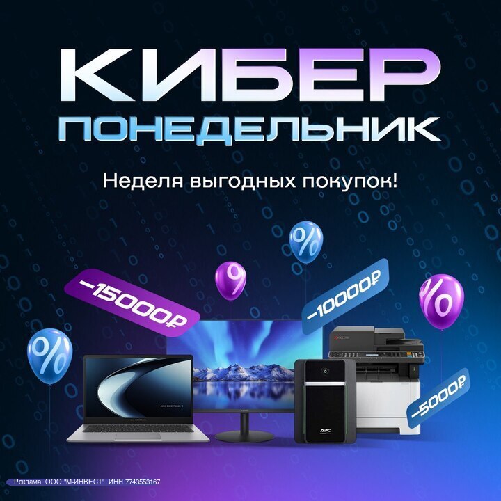 Киберпонедельник на xcom-shop.ru. Самое время приобрести технику без угрызений совести. Ищите промокоды на сайте и получайте скидку до 15 000₽ на ноутбуки и мониторы.