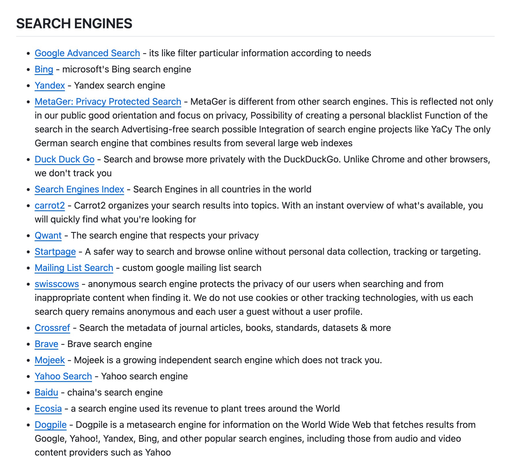 • Метапоисковики и поиск по специфическим типам данных — кэши, PGP-ключи, публичные бакеты, прямые ссылки и подобное.