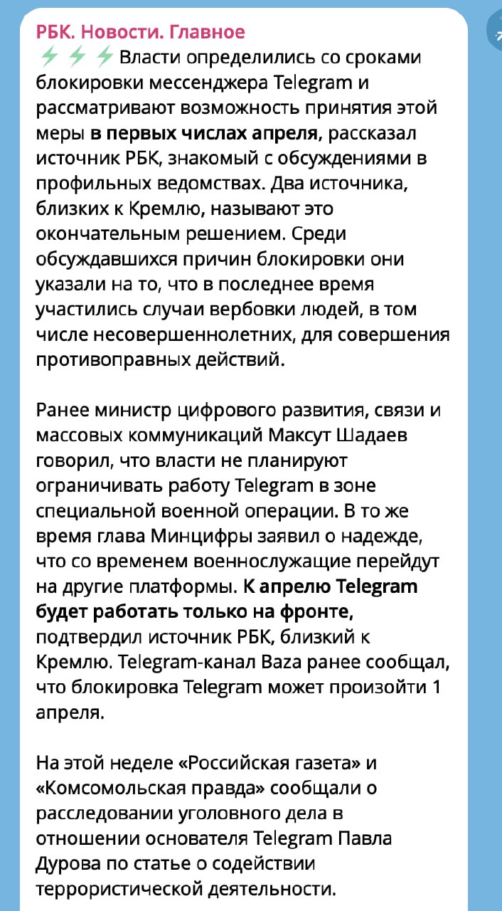 ⚡️⚡️ Телеграм ТОЧНО ЗАБЛОЧАТ с 1 апреля — СМИ со ссылкой на Кремль. По словам источников, решение ОКОНЧАТЕЛЬНОЕ, потому что мессенджер «используют для вербовки».