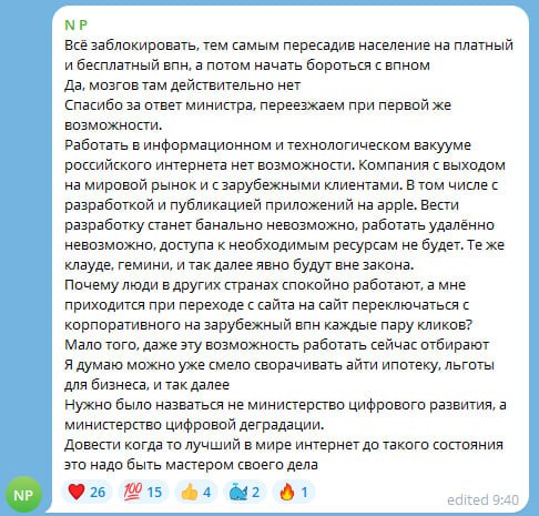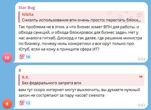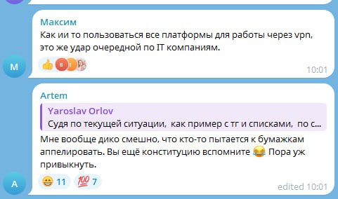 ⚡️ Айтишники УНИЧТОЖАЮТ оплату за VPN-трафик и возможное лишение IT-компаний аккредитации. В официальном чате Минцифры происходит ад: гневные сообщения летят чуть ли не каждую минуту — уровень хейта в этот раз действительно запредельный.
