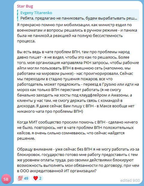 Более того, моя организация направляла РКН запросы, чтобы рабочие айпи могли пользовать ВПН в внешнюю сеть (напомню, мы работаем на мировом рынке) - нас проигнорировали. Сейчас мы переходим в стадию тушения пожаров, все что работодатель может предложить - переезд в Грузию или идти на мороз как только ВПН перестанет работать.