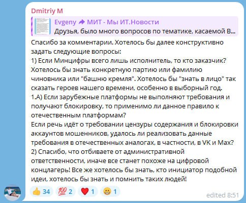 Если Минцифры всего лишь исполнитель, то кто заказчик? Хотелось бы знать конкретную партию или фамилию чиновника или "башню кремля". Хотелось бы "знать в лицо" так сказать героев нашего времени, особенно в выборный год.