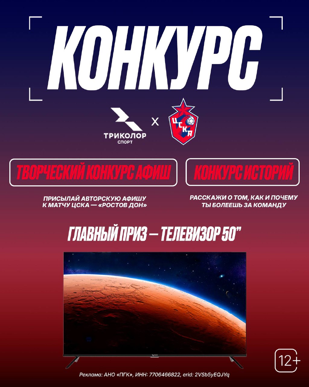 Общие сроки проведения конкурса «Триколор Спорт»: твоя афиша — наша история»: с 26.01.2026 г. по 28.02.2026. Конкурсные работы принимаются по 16.02.2026 г. С информацией об организаторе акции, правилах проведения, условиях и ограничениях, можно ознакомиться на tricolor.ru (12+)