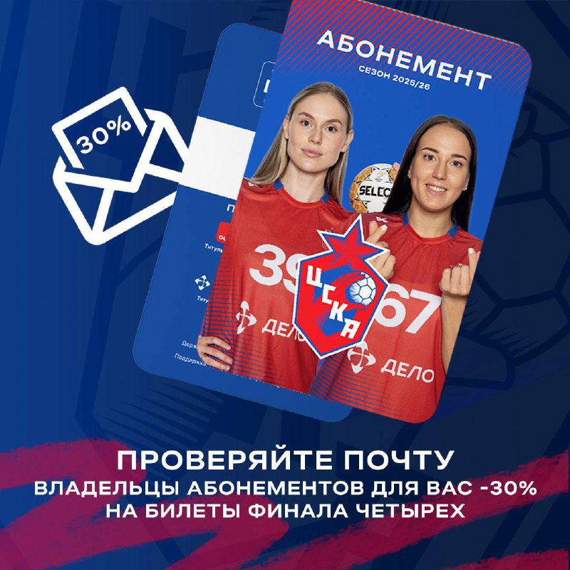 ❗️Хотим порадовать всех владельцев абонементов эксклюзивным предложением. Сегодня каждому из вас поступит письмо на электронную почту с индивидуальным промокодом, дающим скидку в 30% на покупку билетов на предстоящий «Финал четырех» 👀
