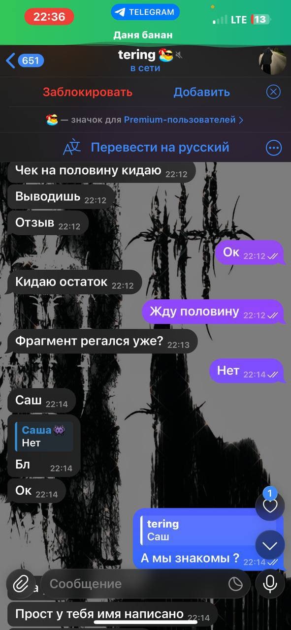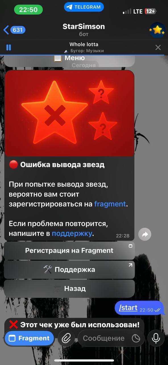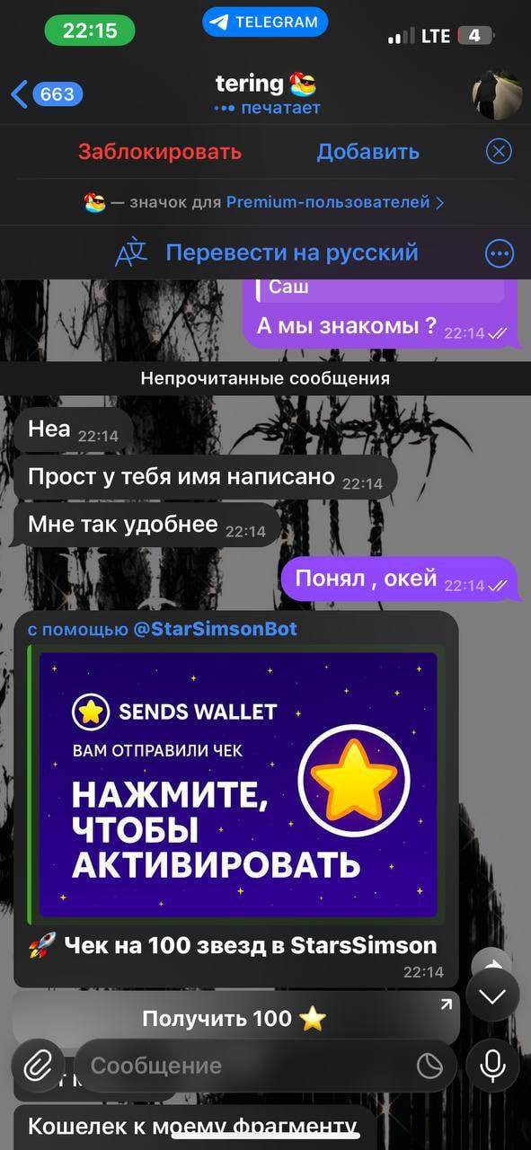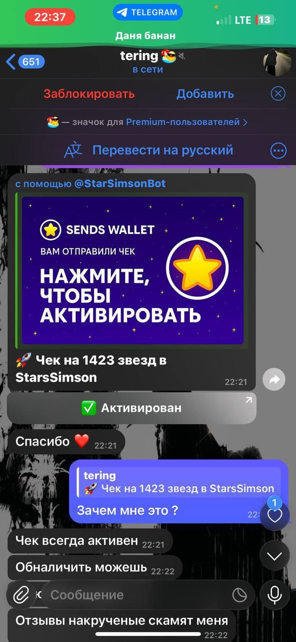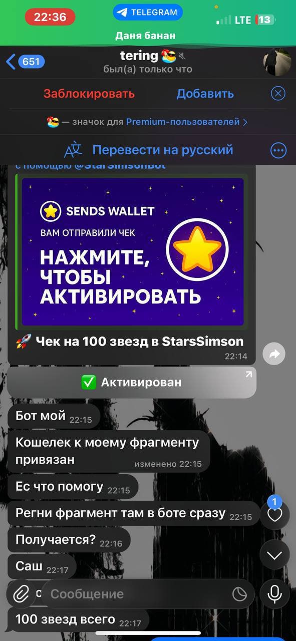 🌬️ Новая мошенническая схема с помощью фейк-чеков на Telegram Stars Сегодня к нам обратился один из пользователей наших проектов и рассказал про новую, набирающую обороты к использованию схему с фейковыми чеками на звезды, ввиду чего, разъясняем 🖥 Суть схемы: 🔴Вам пишет скамер, предлагает оставить фейк-отзыв об его работе за соответствующую плату, и при этом он уверяет, что конечно же скинет вам звезды наперед 🔵В случае вашего согласия, потенциальный мошенник сразу скидывает вам звезды, но не с помощью функционала телеграма, а с помощью так называемого "чека", перейдя по которому вы попадаете в интерфейс бота якобы для его активации, однако, вывести звезды не сможете (появится ошибка), бот попросит вас привязать свой аккаунт во Fragment 🔴После совершения вами данных действий, скамер получает доступ к вашему аккаунту и всему его содержимому Пользователь который пытался провернуть данную схему, уже находится в реестре скамеров, ознакомиться можно в топике "Скам-лист" - тут Благодарим за прочтение 🤝 #Важно | @Garantj