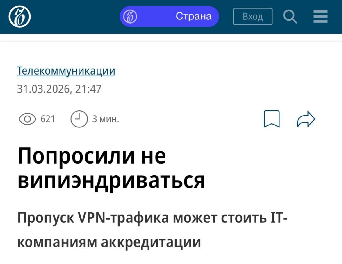 Не смогли в бан телеги, взялись за VPN: IT-компании, сервисы которых будут доступны через VPN, могут лишиться аккредитации, пишет «Коммерсант».