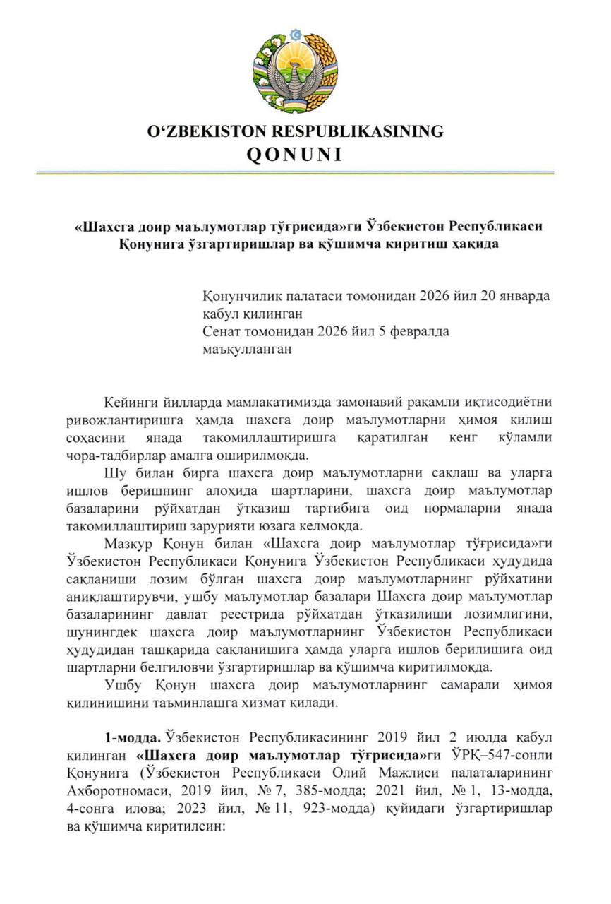 ❗️Nihoyat, kutilgan qonun qabul qilindi: ayrim turdagi shaxsiy ma’lumotlarni O’zbekistondan tashqarida saqlashga ruxsat berildi