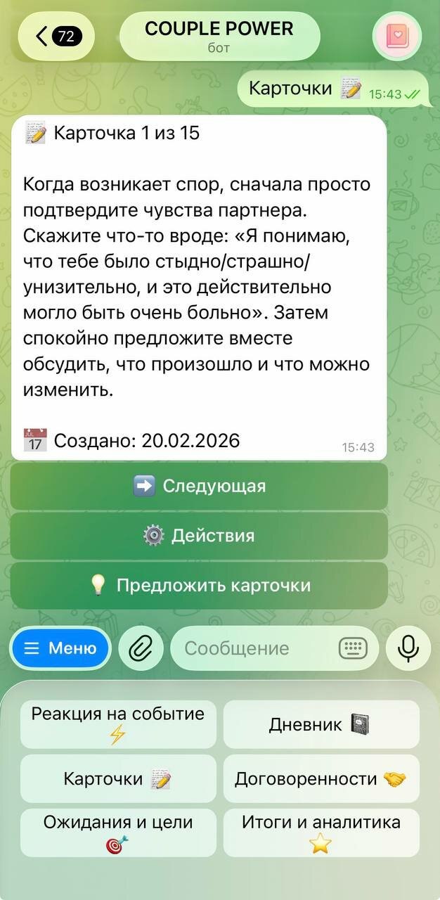 Вы пишете о чувствах, ожиданиях, целях — бот анализирует динамику отношений, подсвечивает важное и даёт личные рекомендации.