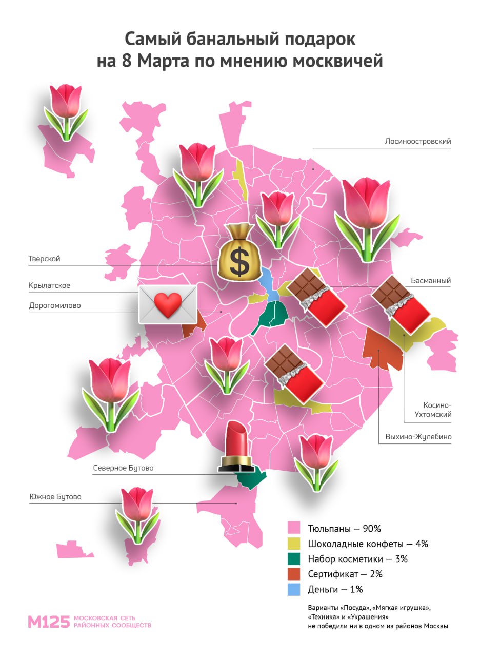 🌷В рейтинге банальных презентов с перевесом в 90% победили тюльпаны — вариант лидирует в Дмитровском, Строгино, Академическом и еще 101 районе Москвы
