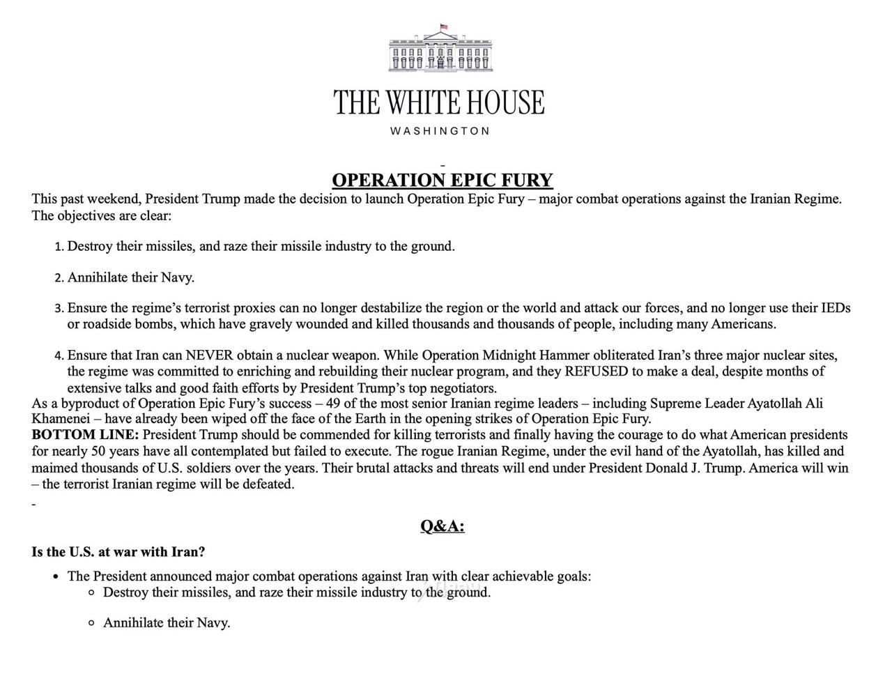 🔸Белый Дом официально объявил, что действия против Ирана — не война, а КВО (крупная военная операция), и назвал её цели: