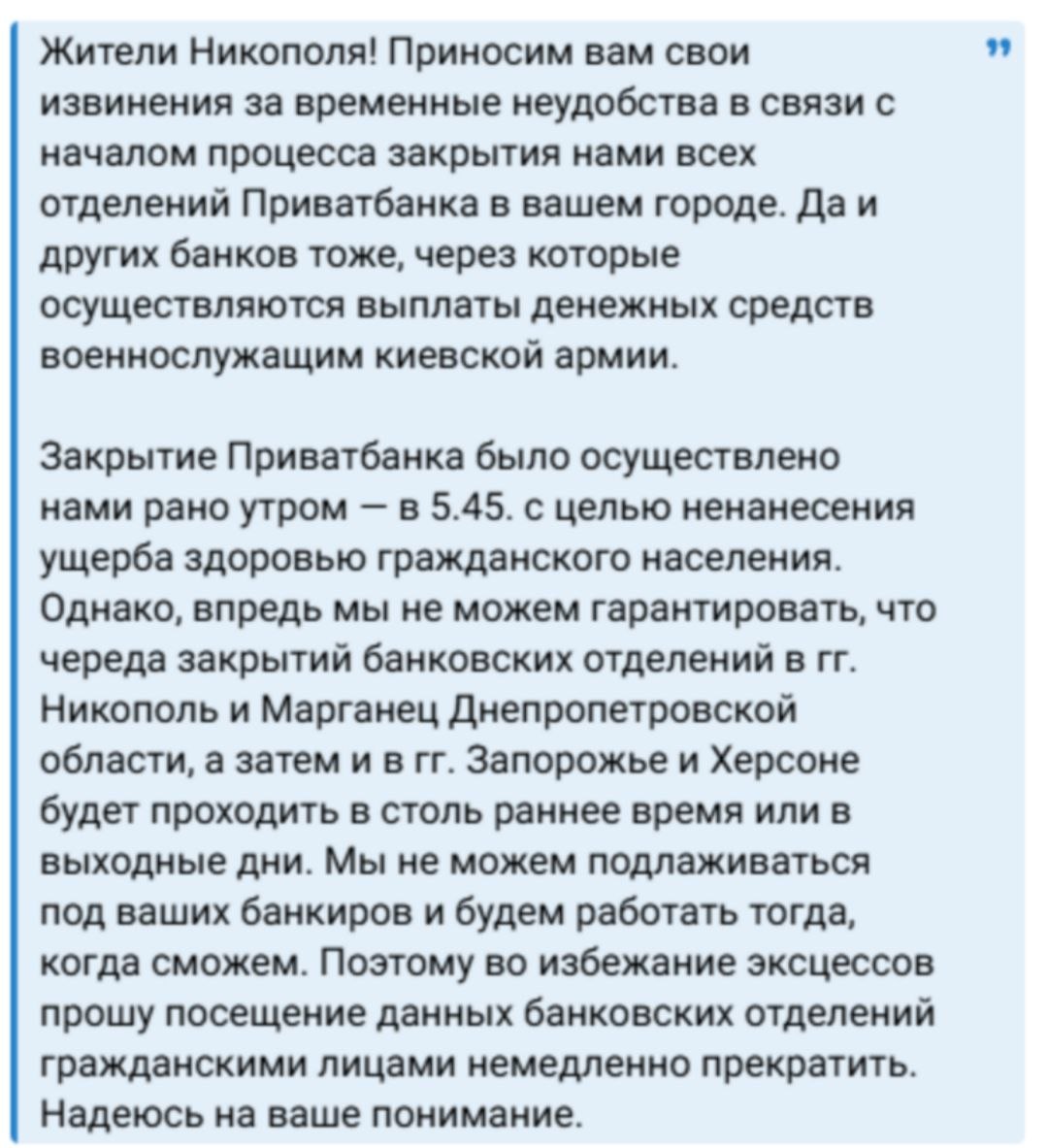 Один з посадовців рф прокоментував ранкову атаку на Нікополь, під час якої було знищено відділення ПриватБанку.