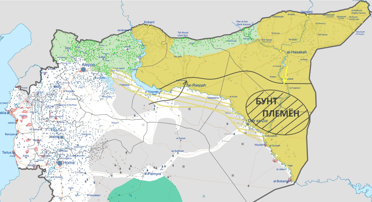 Между тем, понимая, что речь идет уже не о контроле над чем-то, а о выживании, в курдских районах Сирии производится экстренная мобилизация. И также в авральном режиме (буквально с колес) выстраивается фронт примерно по границам провинции Хасака. Где большинством населения являются на сегодня курды. И для этого в первую очередь, как я уже отметил выше, резервы идут на юг. Где курдам удалось даже отбить несколько небольших городков, которые было перешли в руки «новых хозяев».