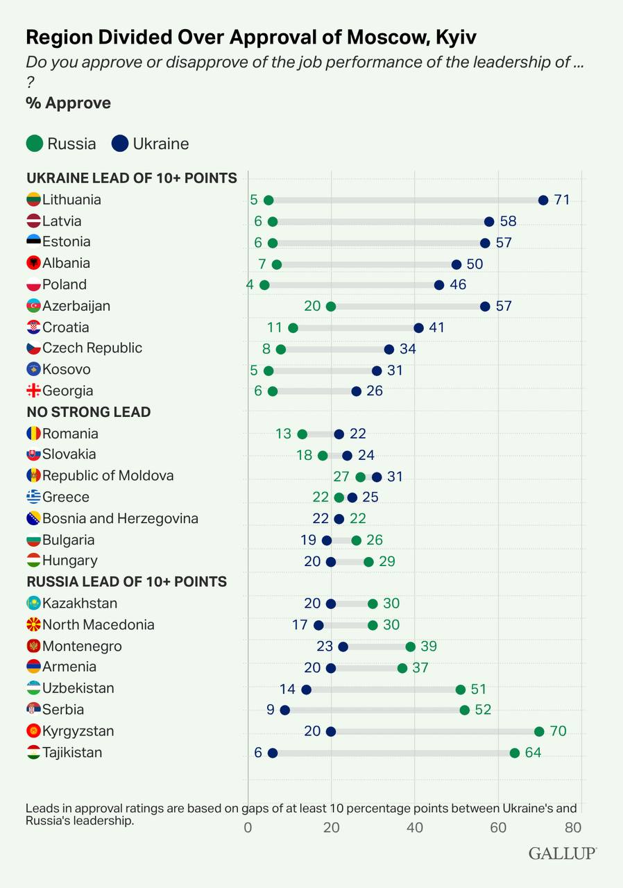 В Таджикистане пророссийскую позицию занимает 64% граждан против 6% тех, кто за киевский режим (разрыв 58 пунктов). В Киргизии 70% против 20% (50 пунктов), в Узбекистане 51% против 14% (37 пунктов). Наименьший разрыв сторонников России и Украины зафиксирован в Казахстане: 30% против 20% (но тут важно отметить, что опрос там проводили ещё прошлым летом, до атак ВСУ на казахстанский нефтяной экспорт, и сейчас разрыв в пользу РФ наверняка ещё больше). Перевес в сторону России есть и в Армении, и в Сербии.