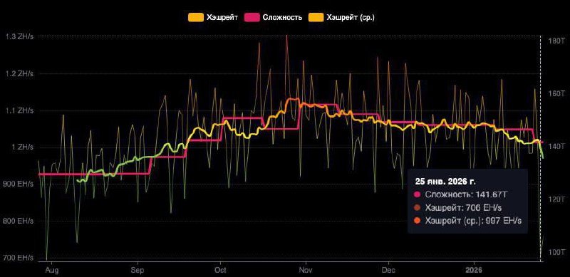 На этом фоне совокупный хэшрейт сети Bitcoin временно снизился до 706 EH/s — минимального уровня за последние шесть месяцев, а среднее время формирования блока увеличилось примерно до 12 минут.