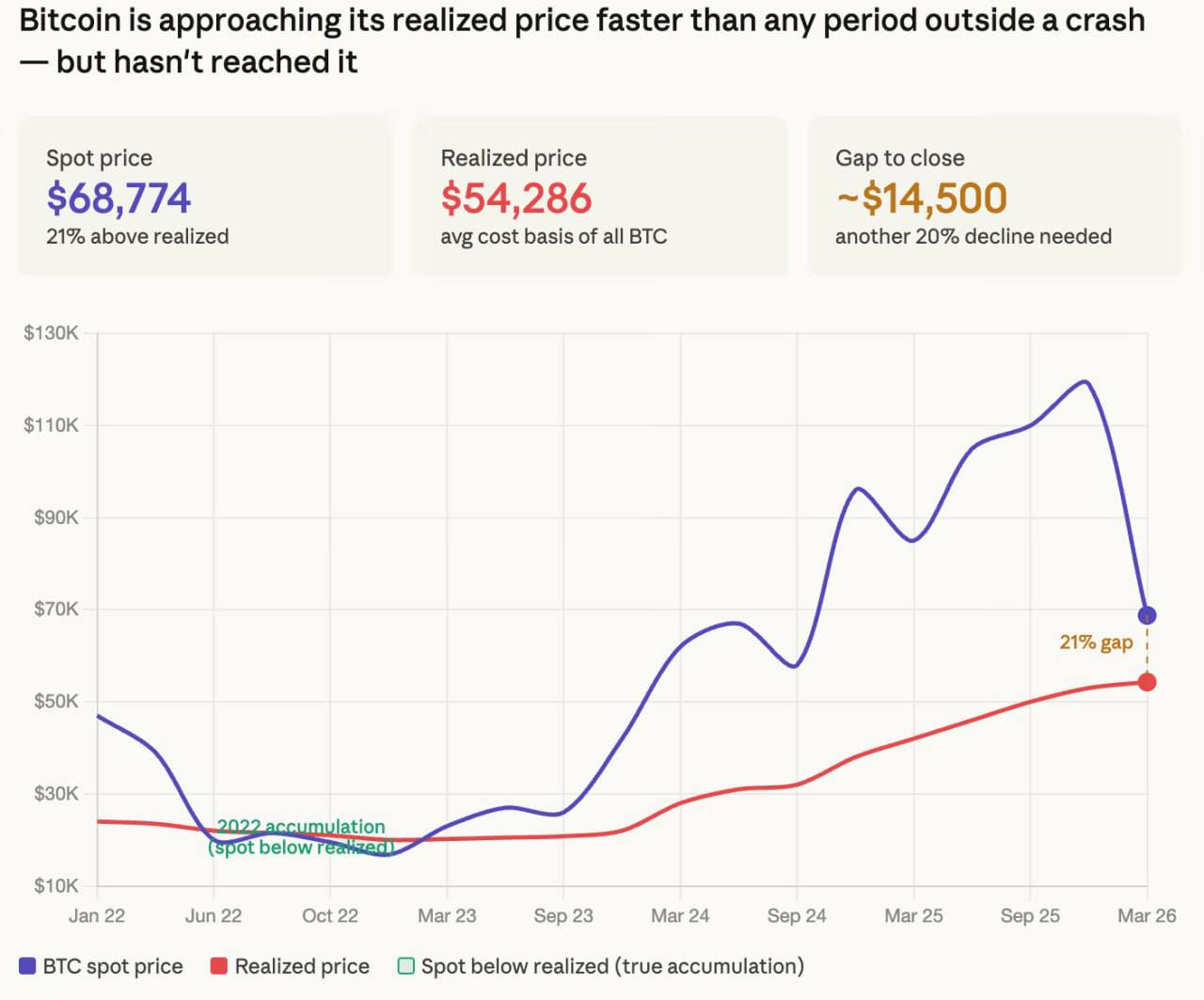 👨🦳 Bitcoin сейчас находится ближе к «зоне покупки», чем за последние три года, но всё ещё торгуется примерно на 21% выше реализованной цены — большинство держателей остаются в прибыли.