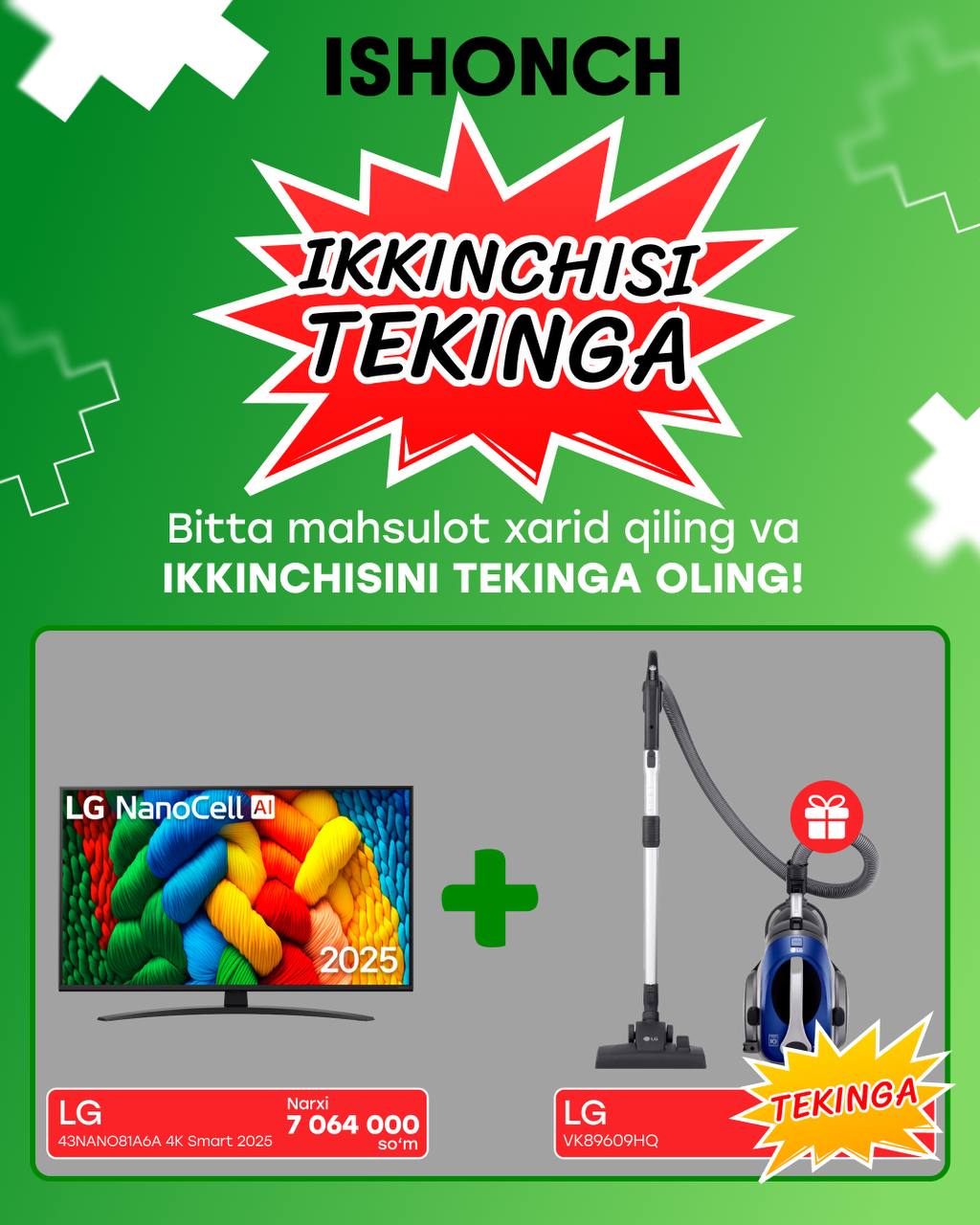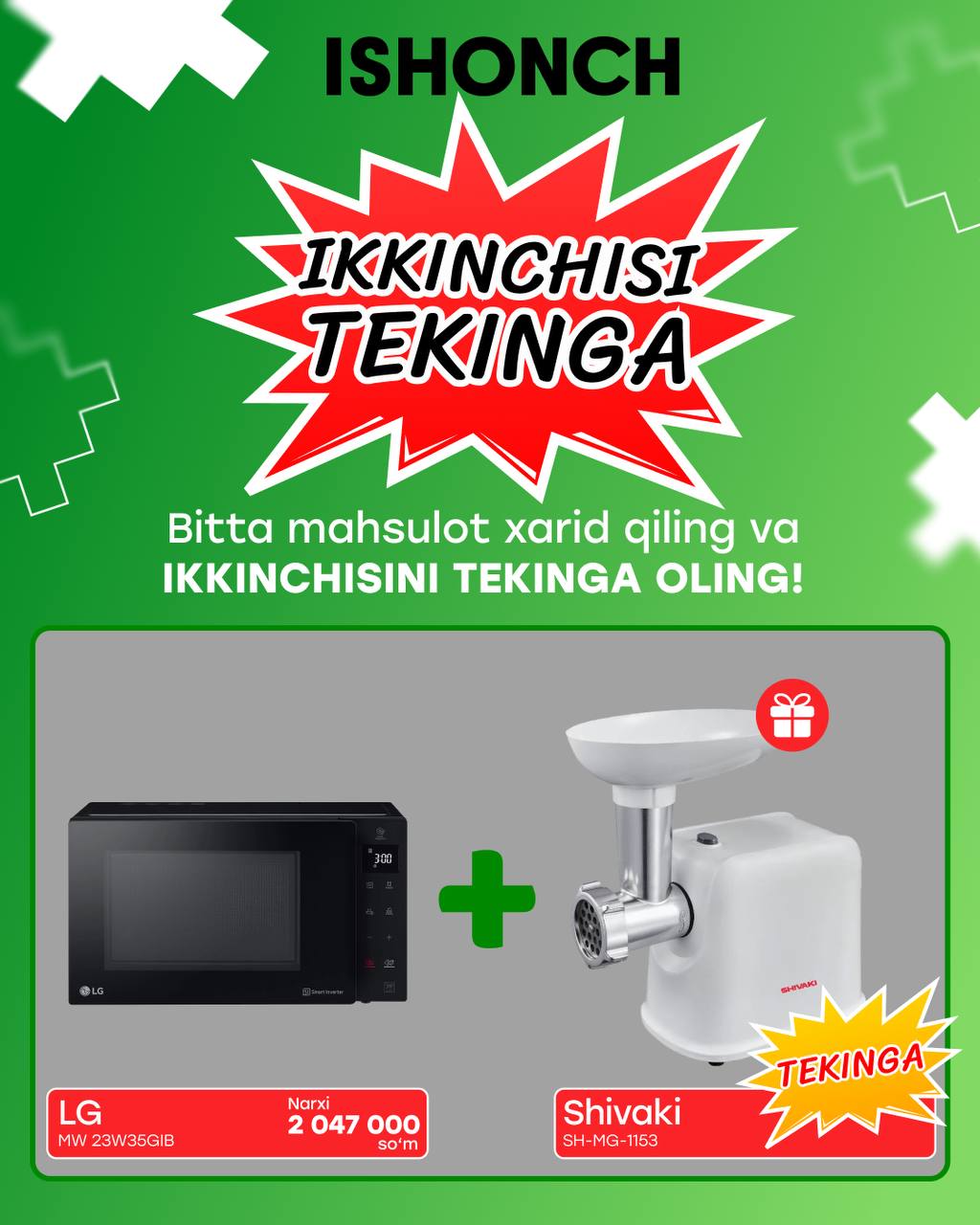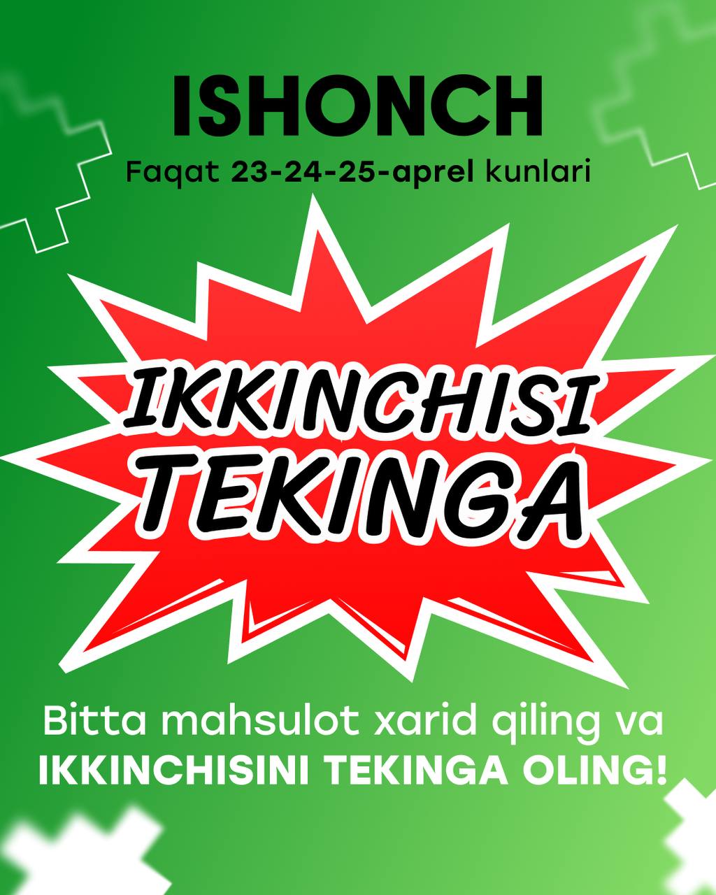 Xarid qilishdan oldin kanalni kursatib Javoxirchempion degan mijozga 100.000 sum Bonus beriladi. Aksiya faqat juma kuni