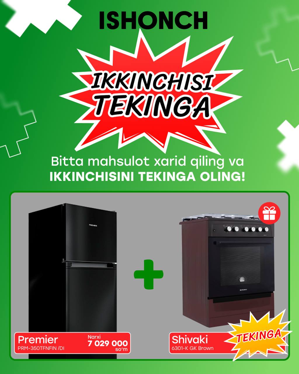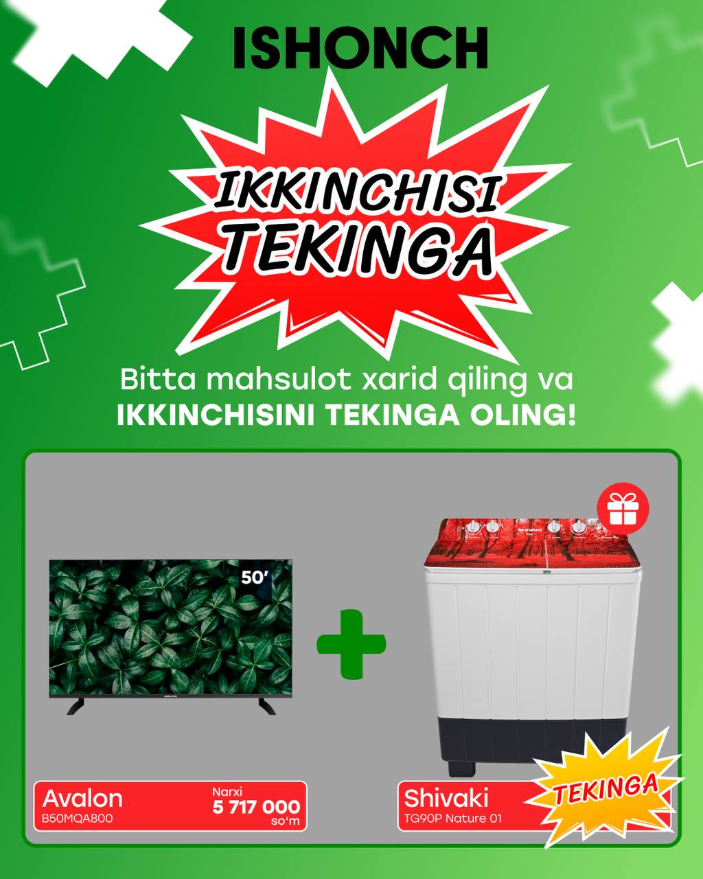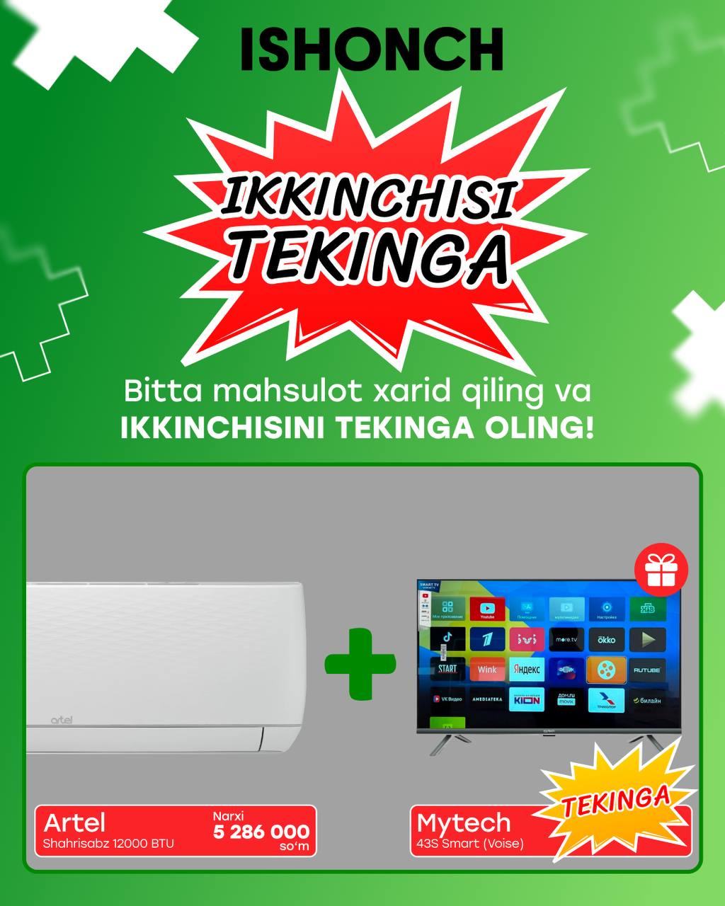 Barcha ISHONCH va ZAR BAZAR do‘konlarida sovitkich,konditsioner, gaz plita, televizor va kir yuvish mashinalari XITOYDA HAM YO'Q NARXLAR bilan sotuvda!