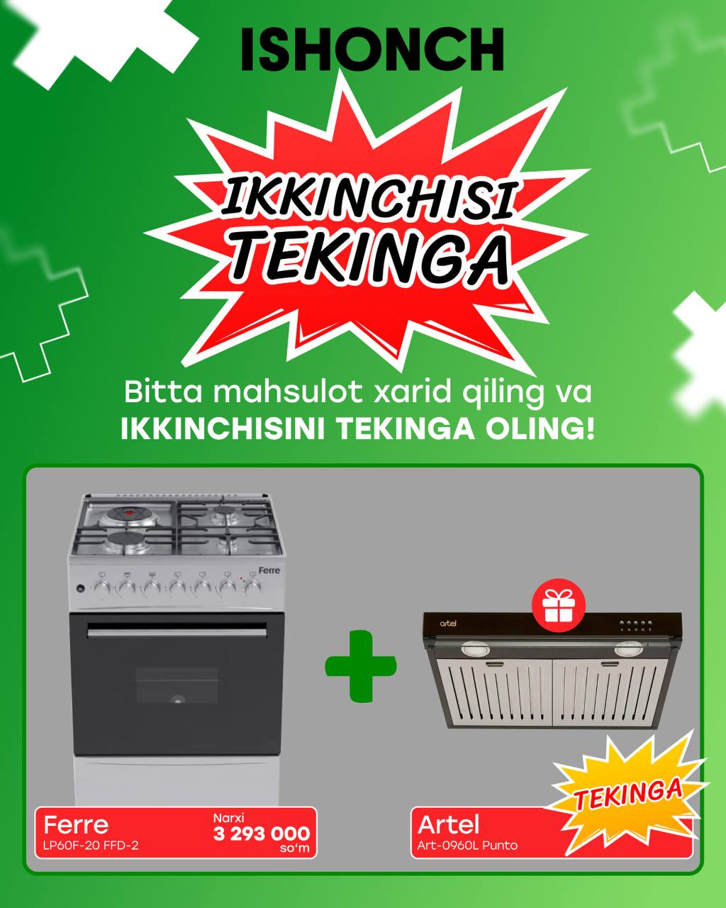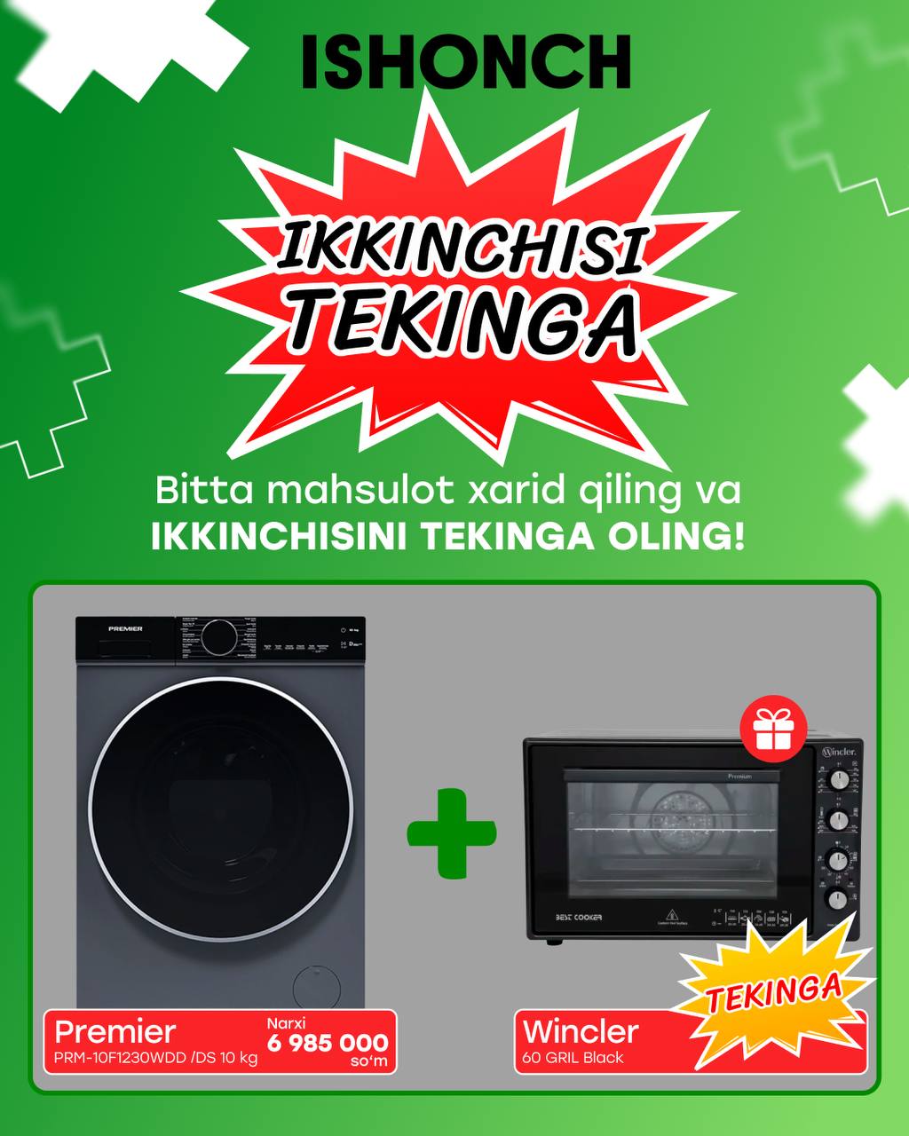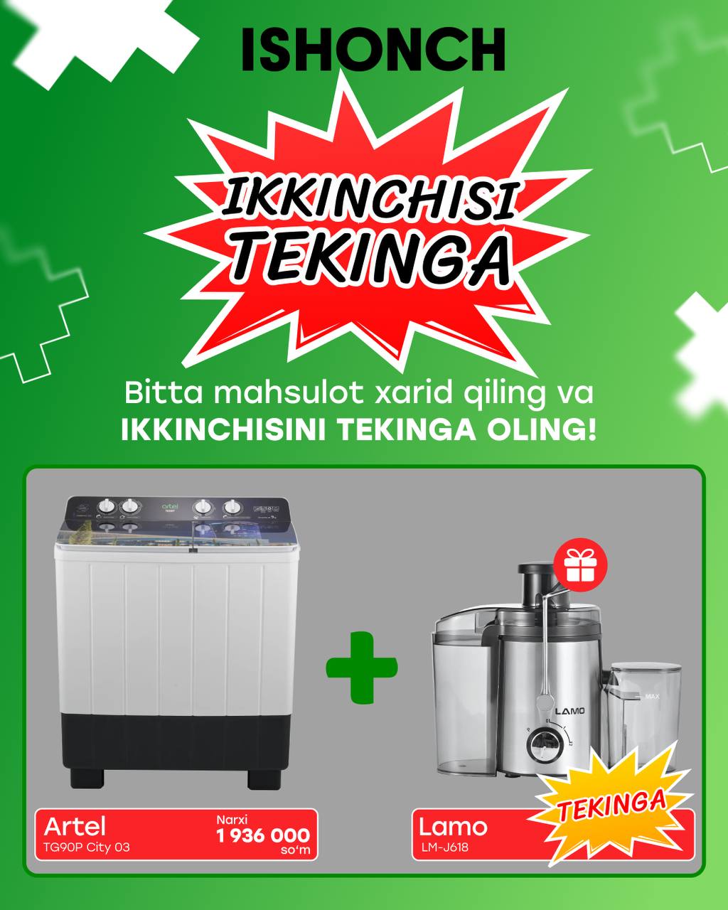Barcha ISHONCH va ZAR BAZAR do‘konlarida sovitkich,konditsioner, gaz plita, televizor va kir yuvish mashinalari XITOYDA HAM YO'Q NARXLAR bilan sotuvda!