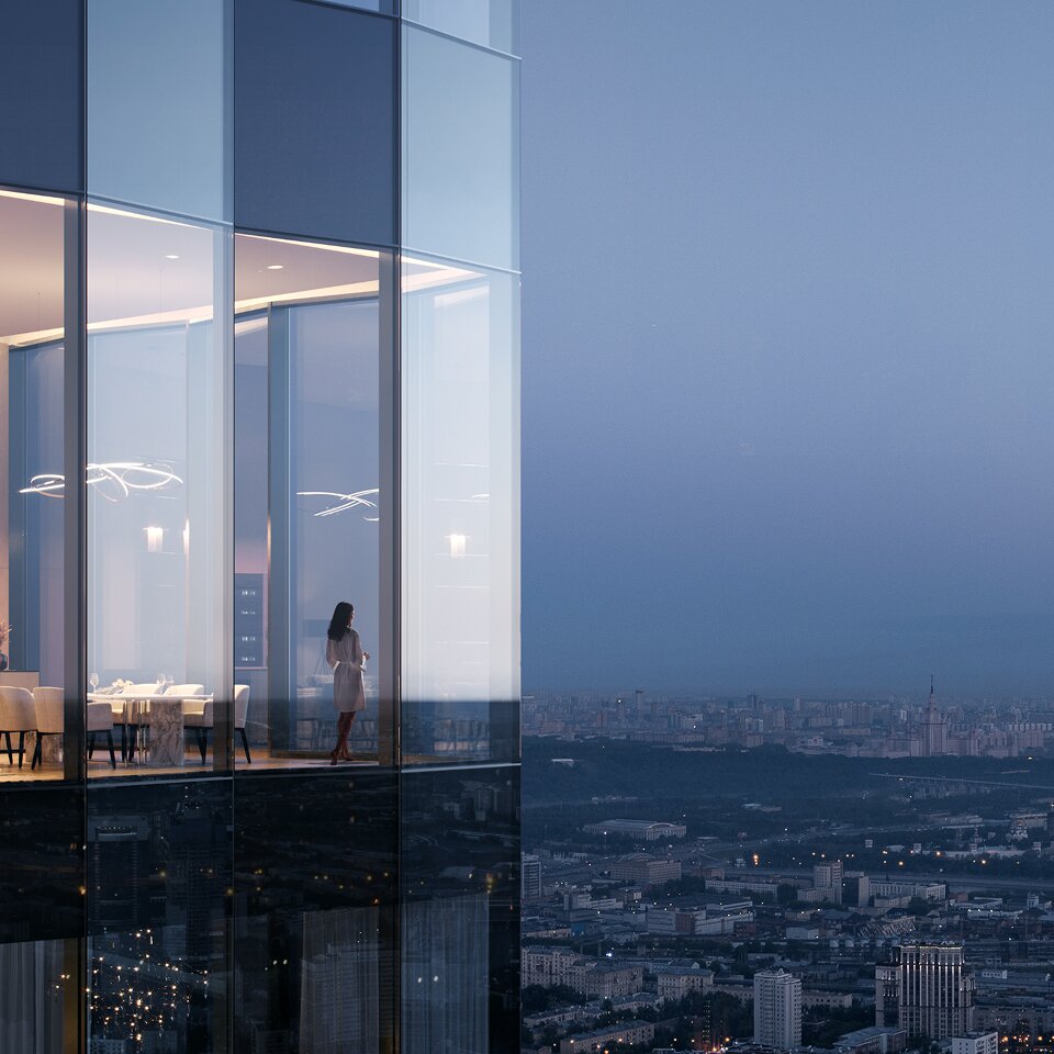 • Панорамный лаунж на 39 этаже с видами на Москву-Сити и ВДНХ.