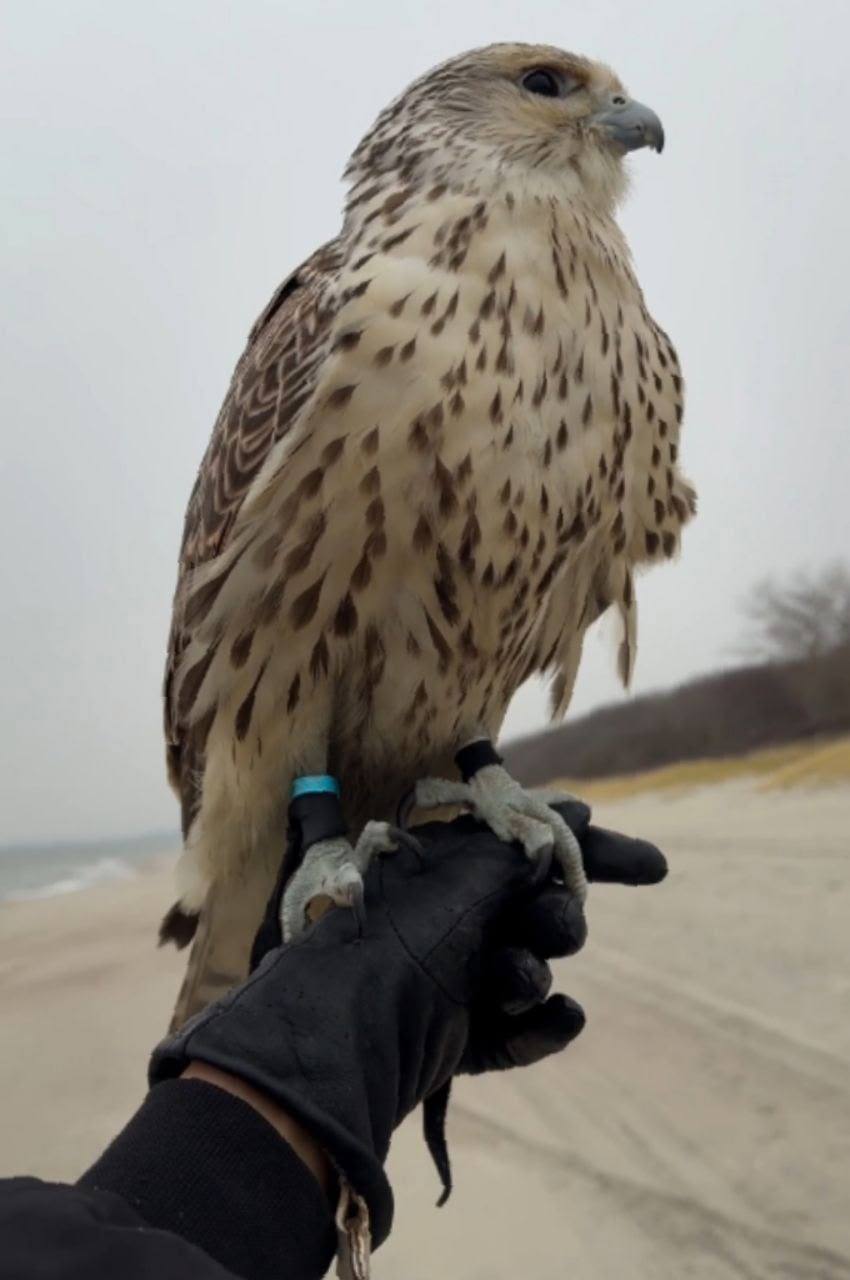 Сокол ручной, с датчиком на спине, в кожаных опутенках черного цвета (кожаные ремешки на лапах), с бирюзовым колечком на правой лапке, отзывается на свист, если встретите свистните и выставите
