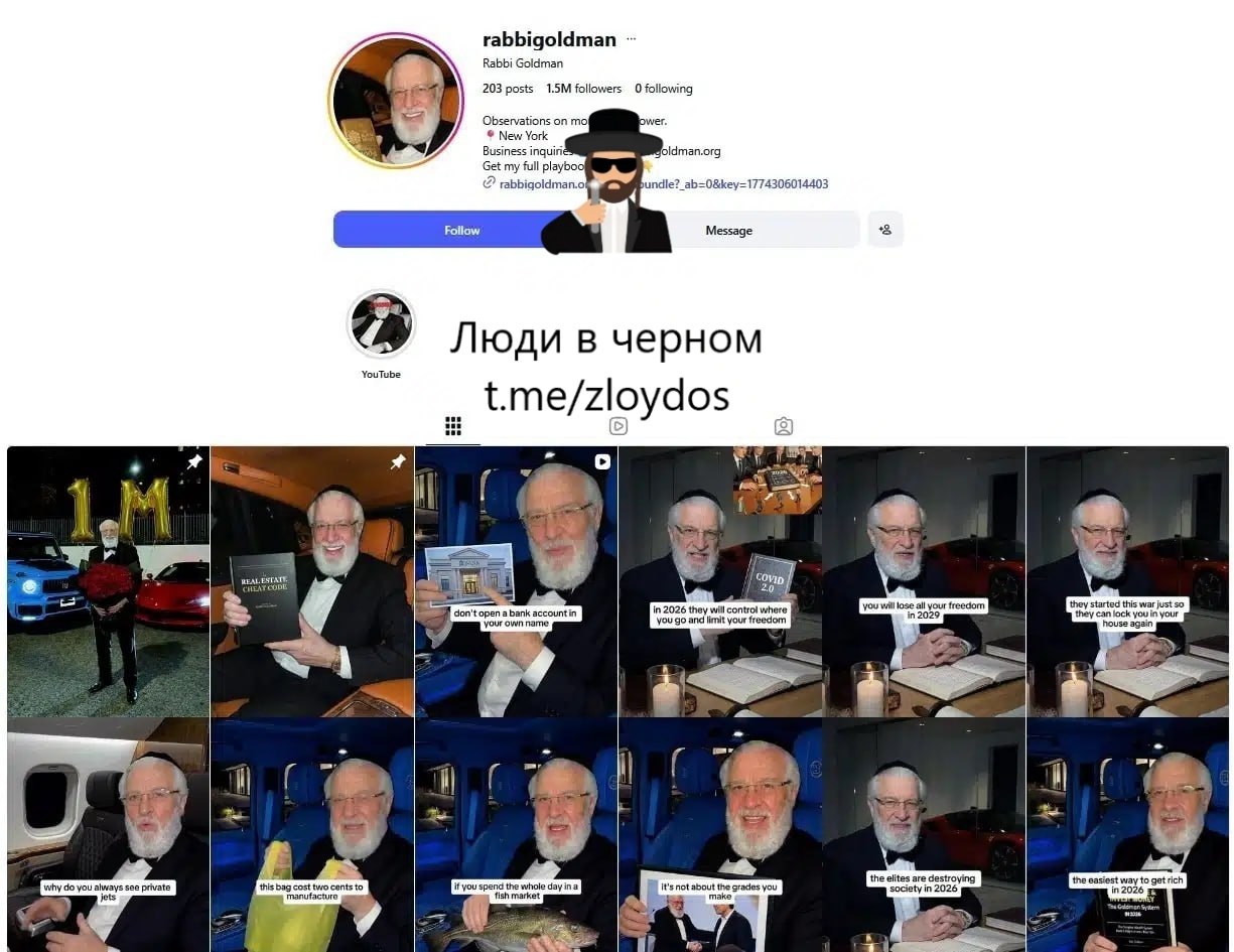 Аккаунт «Rabbi Goldman» демонстрирует многие из них. Например, в одном видео этот раввин в смокинге, сидящий, судя по всему, в салоне роскошного самолета, утверждает, что евреи используют пустые частные джеты для уклонения от налогов.