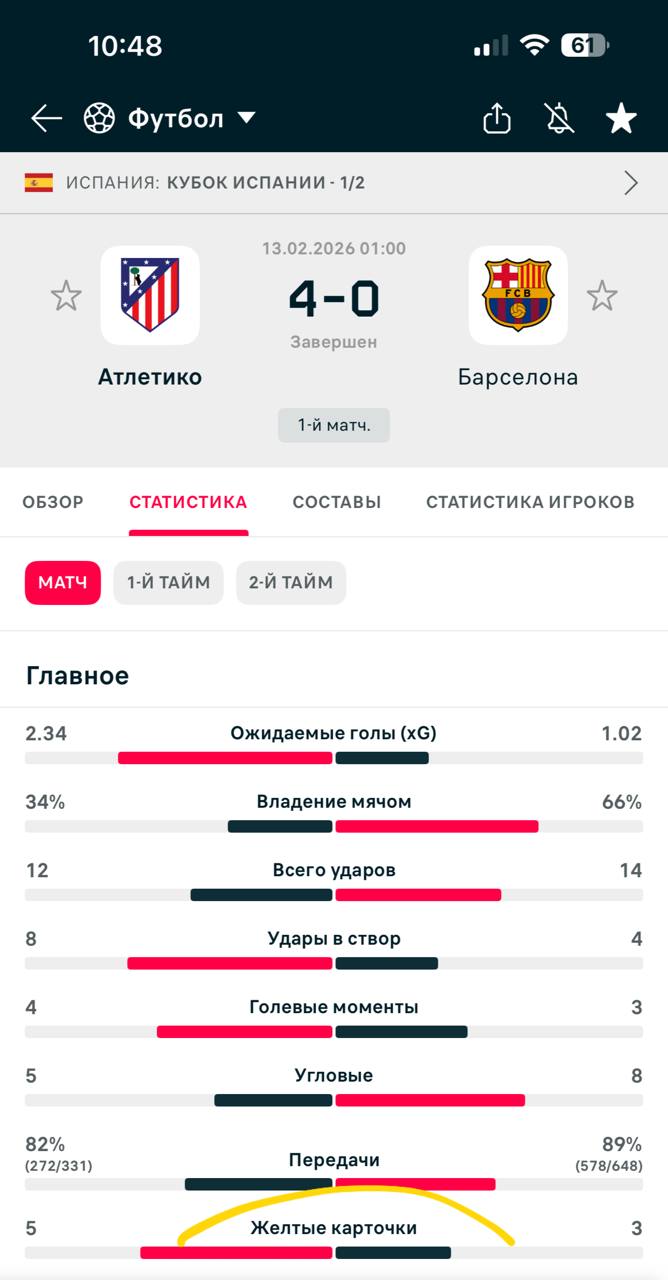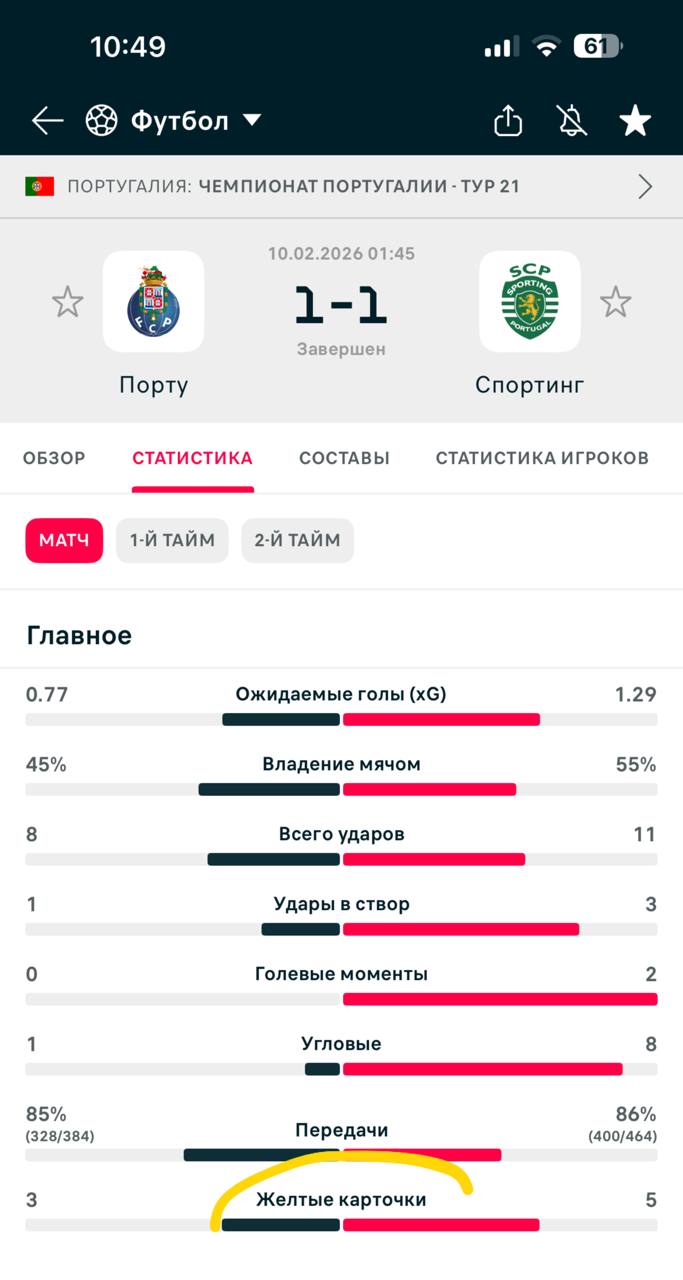 Да , 8 было показано в матче , но одна из них игроку находящемуся не на поле , отсюда фиксируем 7 ЖК и все равно это вновь победа ✅